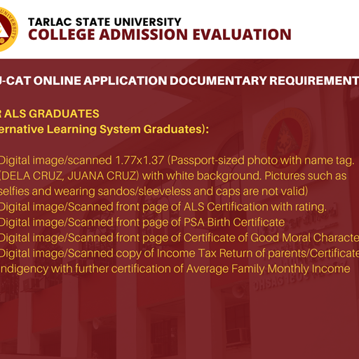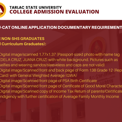 Application and uploading of requirements will only be online via https://cat.tsu.edu.ph every Monday to Friday from 7:00 AM to 6:00 PM.