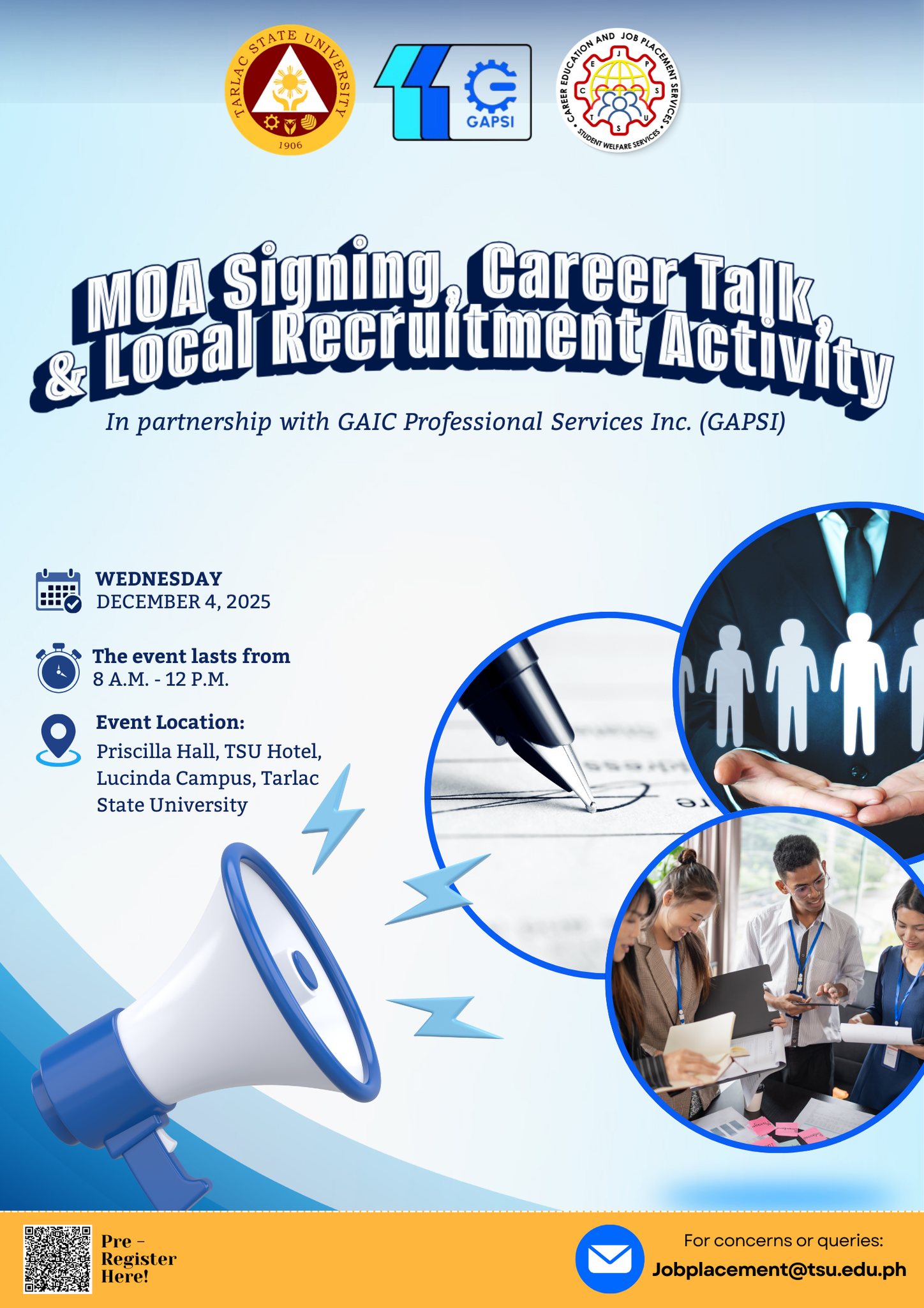 The TSU–Career Education and Job Placement Services Office invites all 3rd year and 4th year students to the Local Recruitment Activity and Career Talk with GAIC Professional Services Inc. (GAPSI).